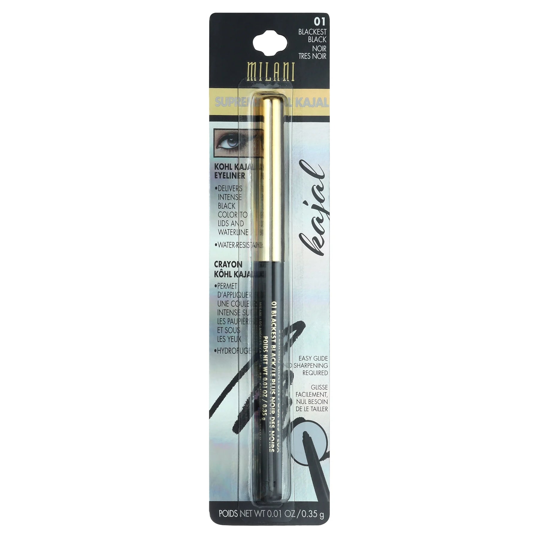Kohl black everything. What's blacker than black? Milani's Supreme Kohl Kajal Eyeliner brings out the smoldering intensity of your eyes with a long-lasting, deep black kohl formula inspired by the ancient eye cosmetic. Tightline, line the inner rims and waterline with our kohl eyeliner with a self-sharpening tip. Create the most daring looks with perfect precision, thanks to the smooth formula of this kajal eyeliner pencil. When you need an ink black edge for any eye look, this kohl eyeliner pencil delivers explosive glamour.