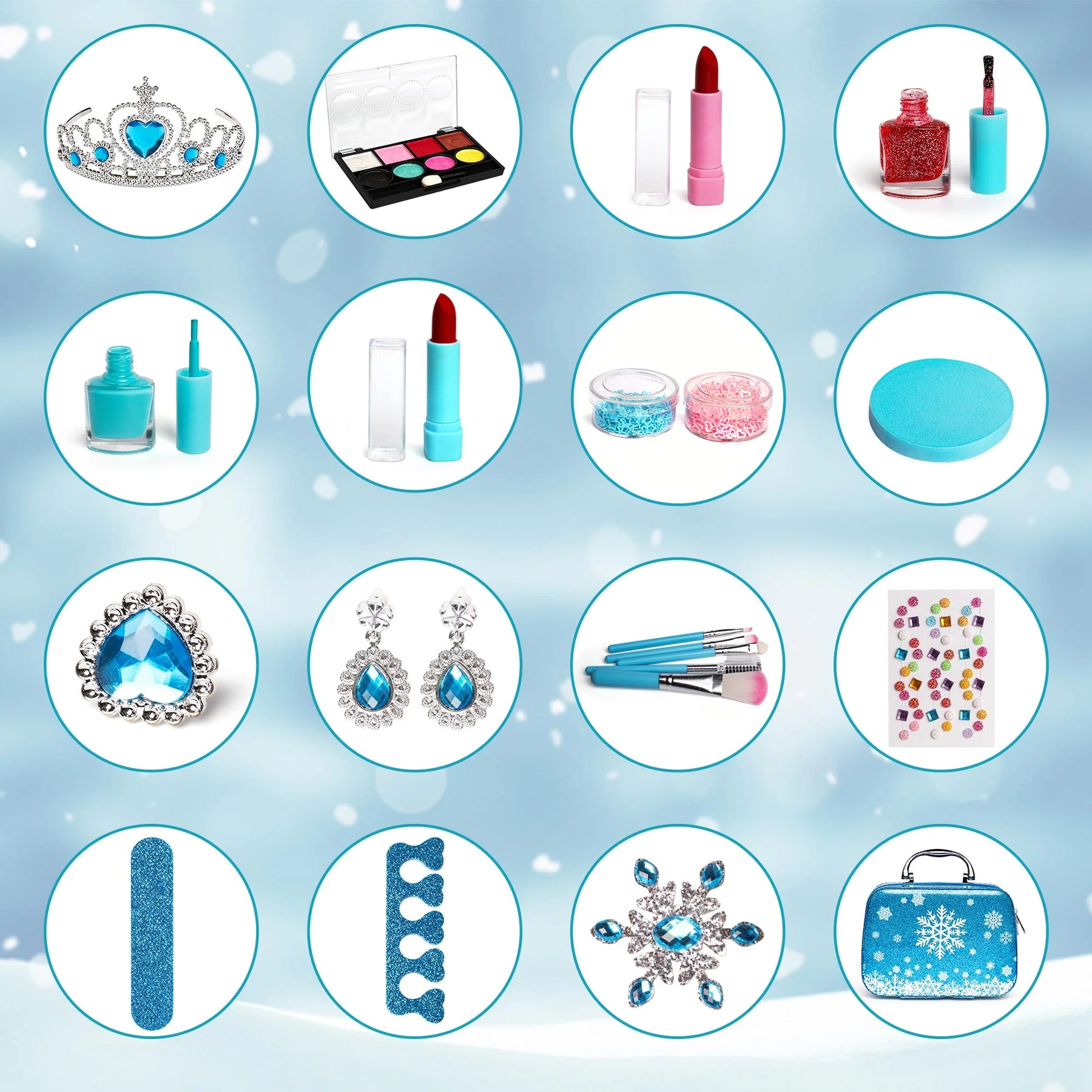 Girls Frozen Theme Pretend Play Makeup & My First Purse Toy for Children Ages 4 5 6 7 Years old. Let your child's imagination come alive with creative fun that will keep them enthralled for hours. It's so much fun to play dress up!!Perfect All in One Cosmetic and Makeup Kit for Pretend Play, Little Cosmetics Makeup Kit for Princess Parties, Novice or Experienced Makeup Artists. The real Frozen cosmetic bag can completely store all the cosmetics and daily toys. Just like Mom’s makeup case. At the end of the game or when travel, Your little princess could organize her many small makeup kit well and is easy to carry it wherever she play. Princess Makeup is a best gift for 4 5 6 7 years old girl; Perfect for Gift, Birthday Christmas Parties, Pretend Play, Play-Dates, Princess Parties, and Dress Up Activities.