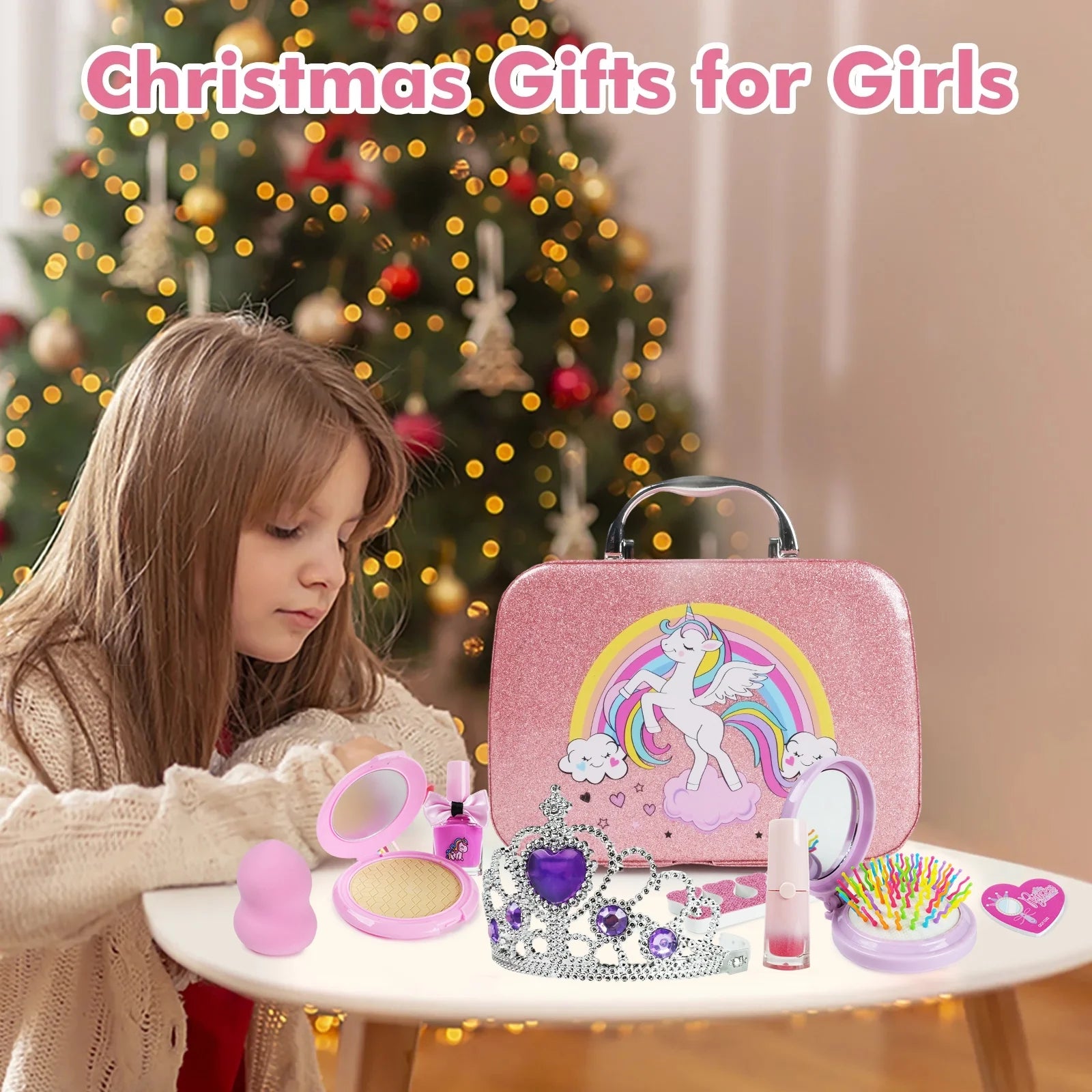 - Comprehensive 24-piece makeup set includes 1 pressed powder, 2 lipsticks, 1 blush, 2 eyeshadows, 1 lip gloss, 2 nail art accessories, 1 toe separator, 1 crown, 2 earrings, 1 ring, 1 spray bottle, 1 mirror, 1 sponge, 1 folding comb, 5 makeup brushes, and a cute unicorn cosmetic case.