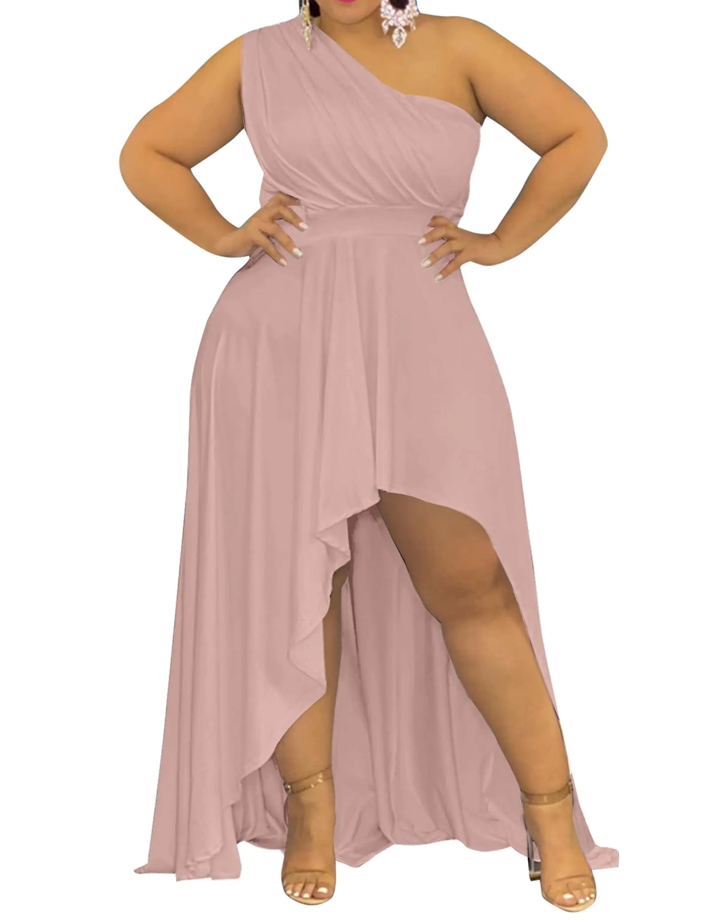 [Material: one shoulder maxi dress is made from 95% polyester & 5% spandex soft fabric comfort to wear stretchy and breathable. Design: plus size maxi dress features one shoulder neckline ruched bust sleeveless elastic empire waist hug your curves high low asymmetrical hem is very flowy floor length maxi dress make your every movement elegant and charming. Feature: black semi formal dresses for women plus size white elegant dresses for women plus size burgundy flowy dress for women plus size blue plus size one shoulder irregular hem dress teal wedding guest dress plus size for curvy women. Occasions: this one shoulder irregular versatile dress is suitable for party cocktail dinner semi formal prom wedding guest birthday and other special occasions. Size: S=US(4-6) M=US(8-10) L=US(12-14) XL=US(16) XXL=US(18) 3XL=US(20) 4XL=US(22) 5XL=US(24). Please Refer To The Size Chart Provided In The Picture.]