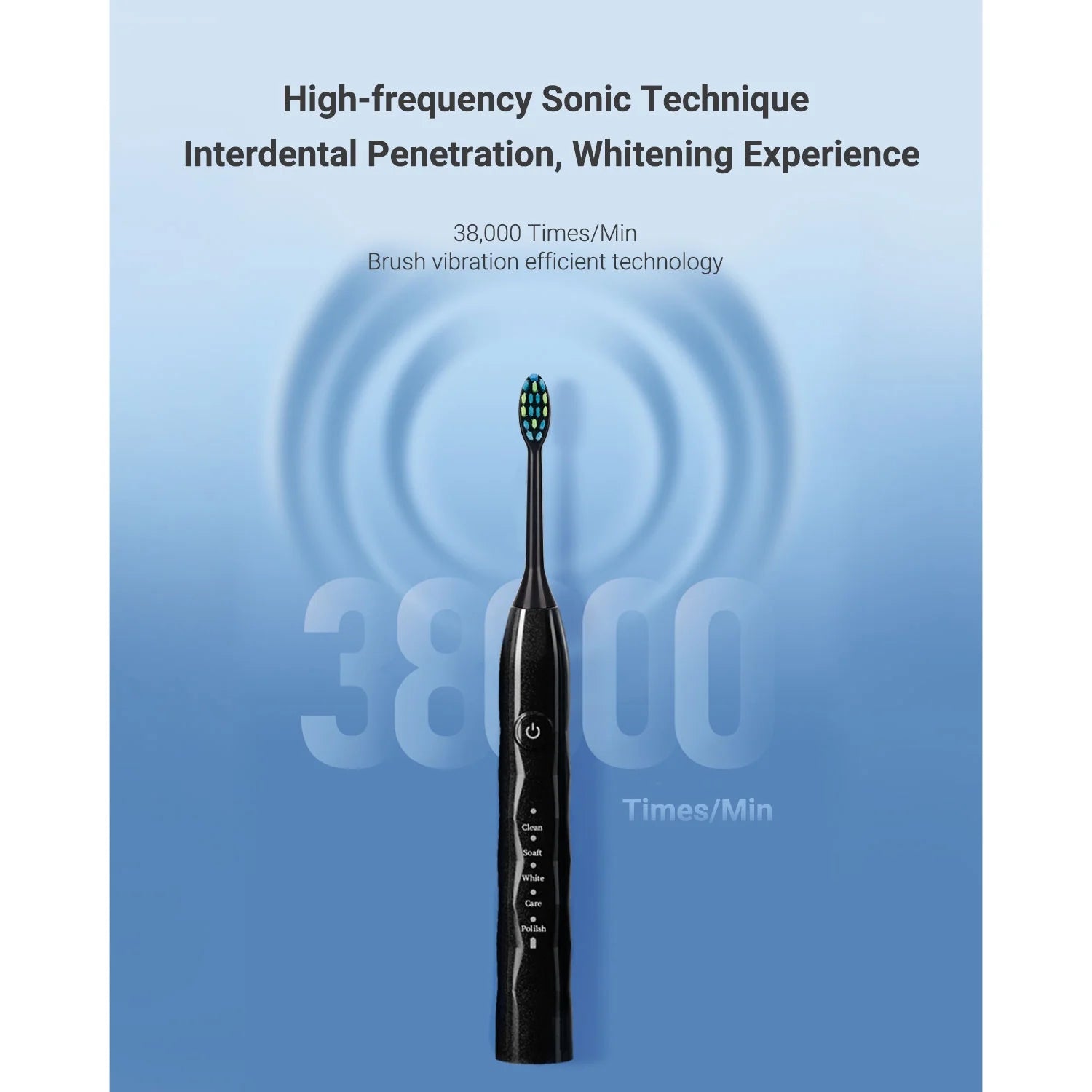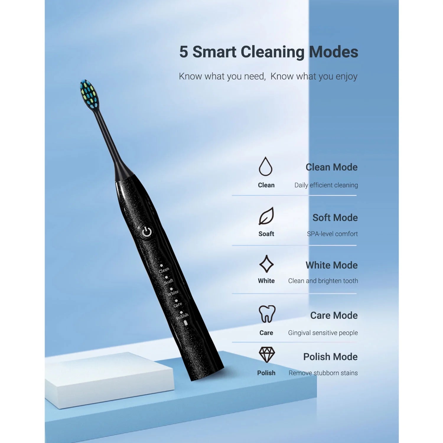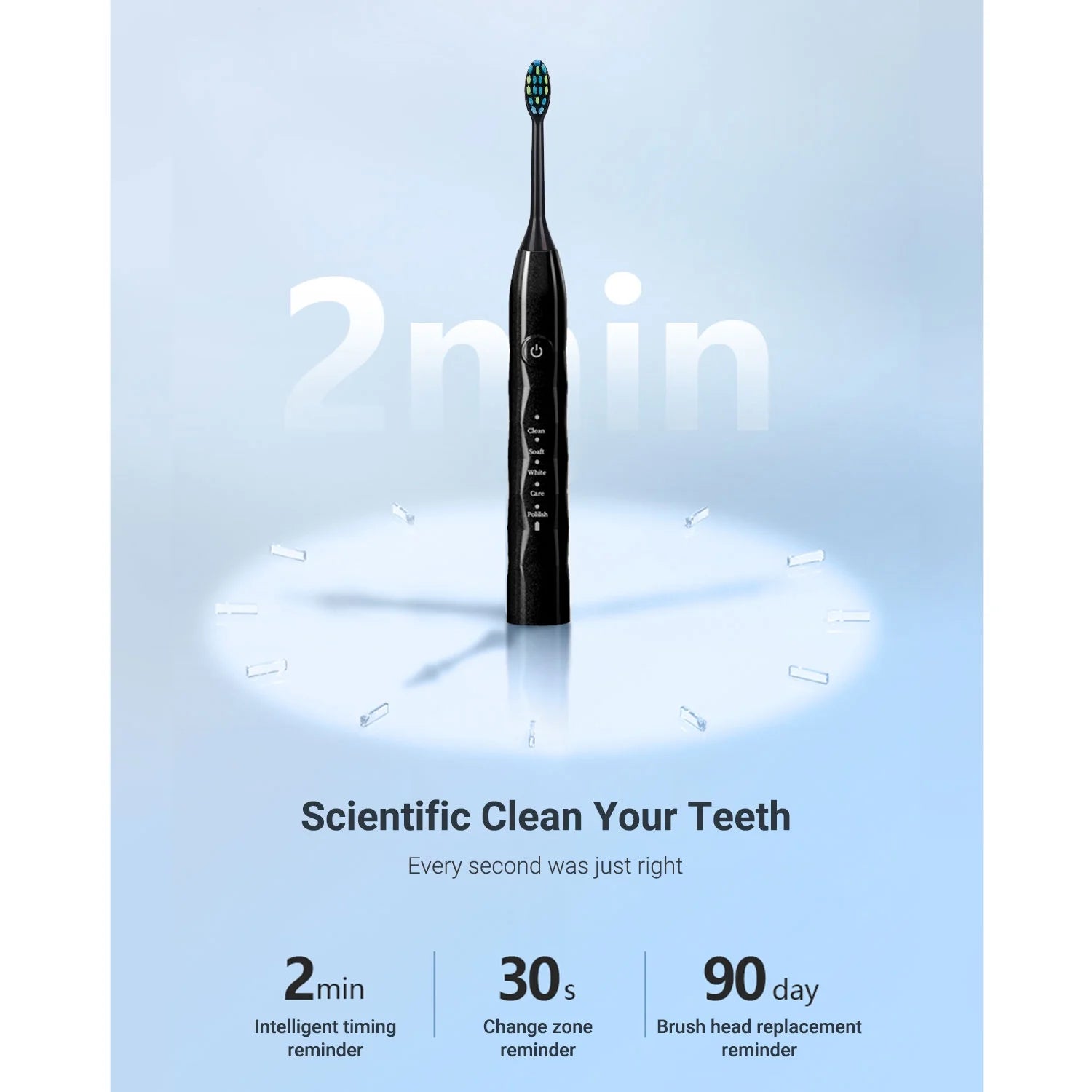 Ultrasonic Electric Toothbrushes, Adult and Kids, Rechargeable, 5 Modes, 4H Charge, 2 Min Timer, with 5 Replacement Heads, Black