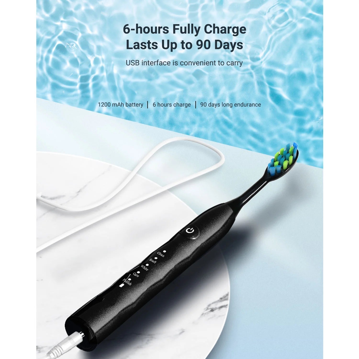 Fairywill always works hard to offer users the highest level of quality and care. 38,000 micro-brushes per minute, this black electric toothbrush gives you a thorough cleaning while making reduced noise. Electric toothbrush with 5 modes for adults and kids, suitable for different conditions of teeth and gums. The 5 soft, w-shape bristles are designed to suit teeth topography and remove up to 100% more stains from hard-to-reach spots. The lightweight handle makes this electric toothbrush suitable for both kids and adults. Rechargeable electronic toothbrush run for more than 90 days with 6 hour charge?longer standby time than any other toothbrush. The ultrasonic toothbrush with ipx7 rated waterproof design, so the entire toothbrush can be safely rinsed with water and user can safely use toothbrush in the bath or shower. USB cable applicable to a usb port, such as phone, power bank and so on, great for carrying and traveling. Each brush head lasts 3 months so 5 will last for more than one year. If the rechargeable toothbrush bristles fade in color, it's time to replace the brush head. And the built-in 2-minute timer pulses every 30 seconds to helps ensure dentist-recommended brushing habits.