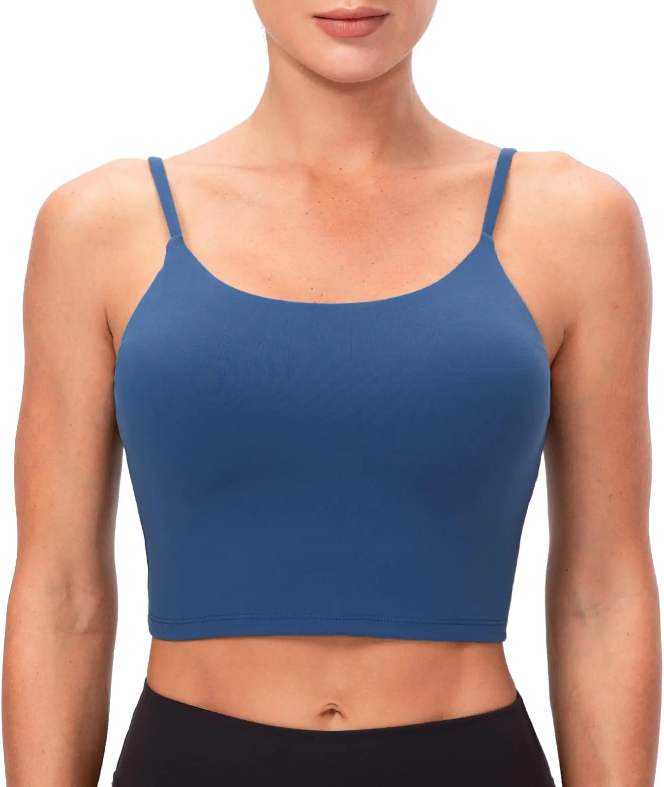 [THE FEEL: Cottony soft and 4-way stretchy THE FIT: Light support for A - C cup size hits above natural waist FEATURES: Scoop neck and spaghetti straps built-in shelf bra with removable pads PERFORMANCE: Breathable n sweat-wicking supportive n high-coverage low-friction BEST FOR: Yoga Pilates and studio practice running workouts or as everyday bra]