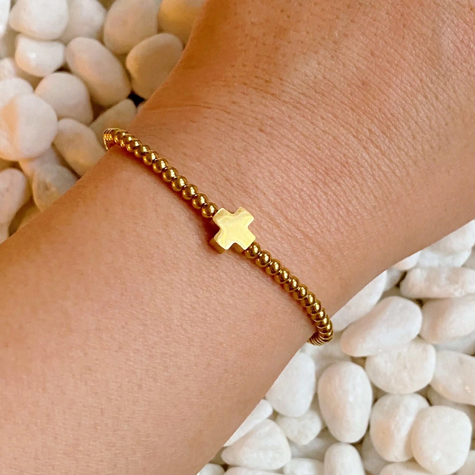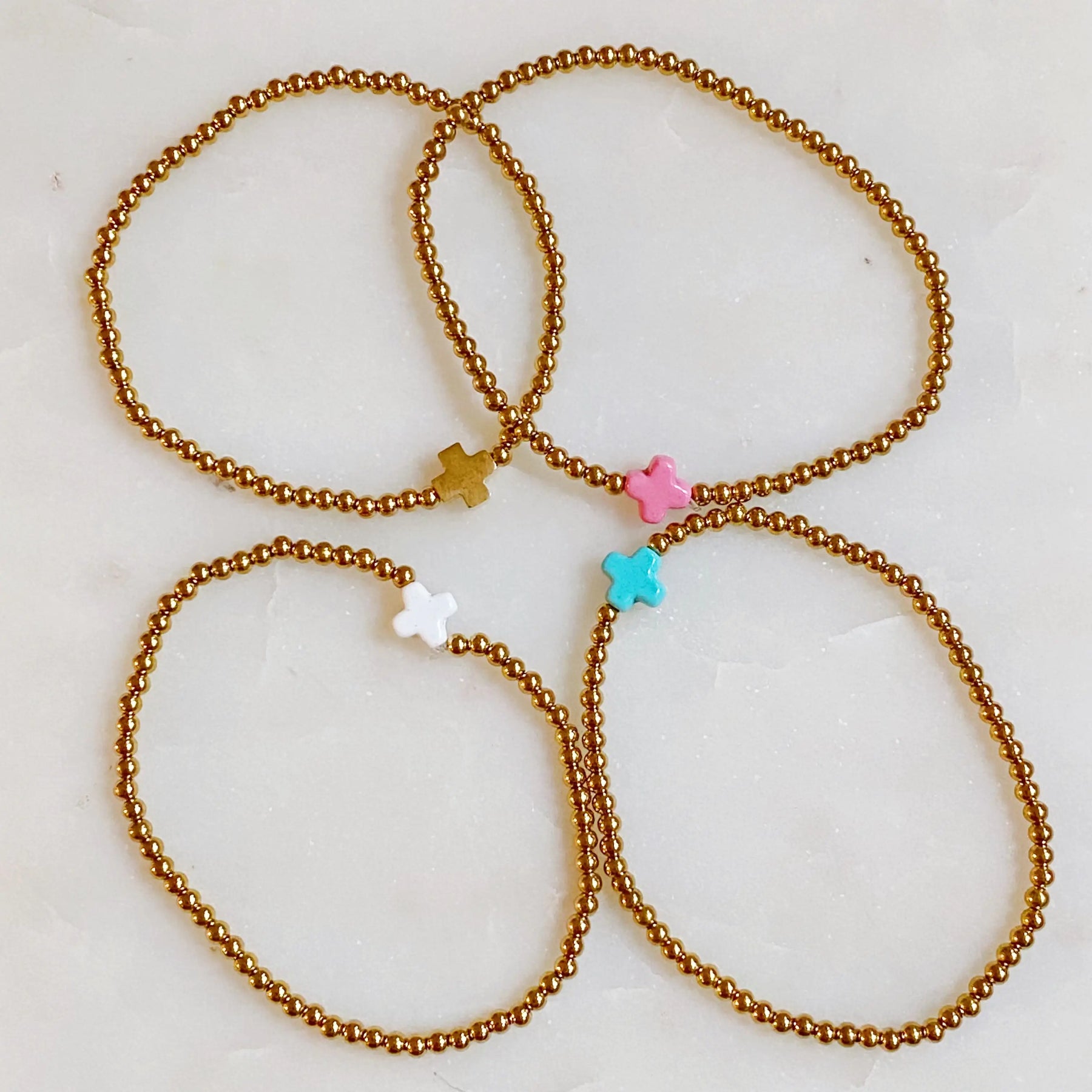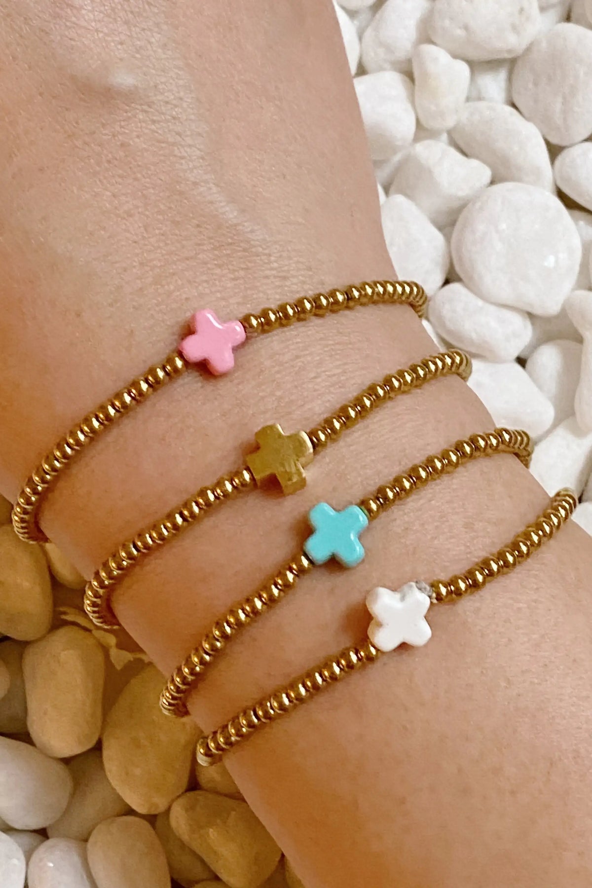 •The gold cross is made with gold plated brass, and the other beautiful colors of cross beads are made from natural stone with enamel finish.